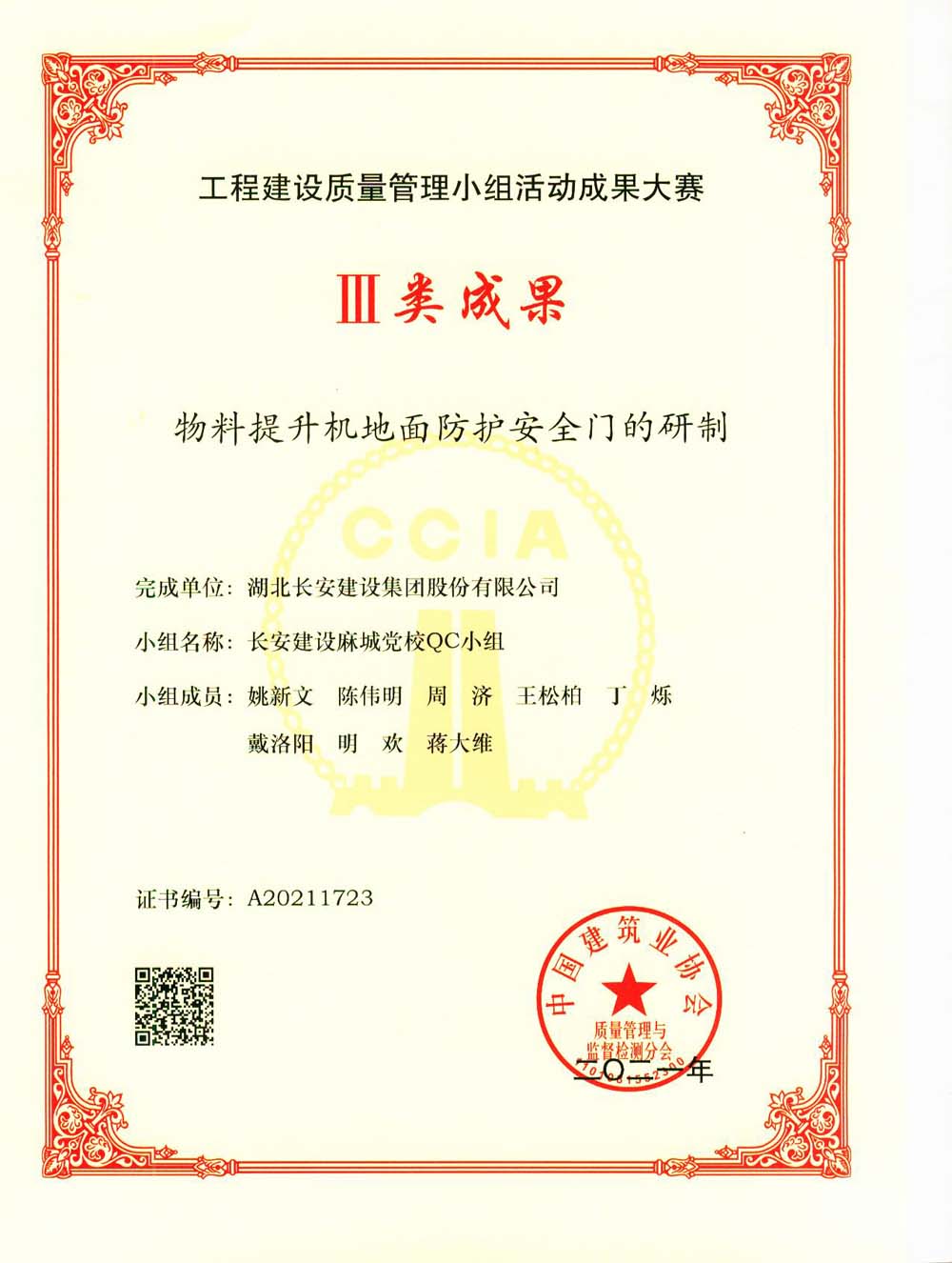 物料提升機地面防護安全門的研制榮獲工程建設質量小組活動成果大賽Ⅲ類成果