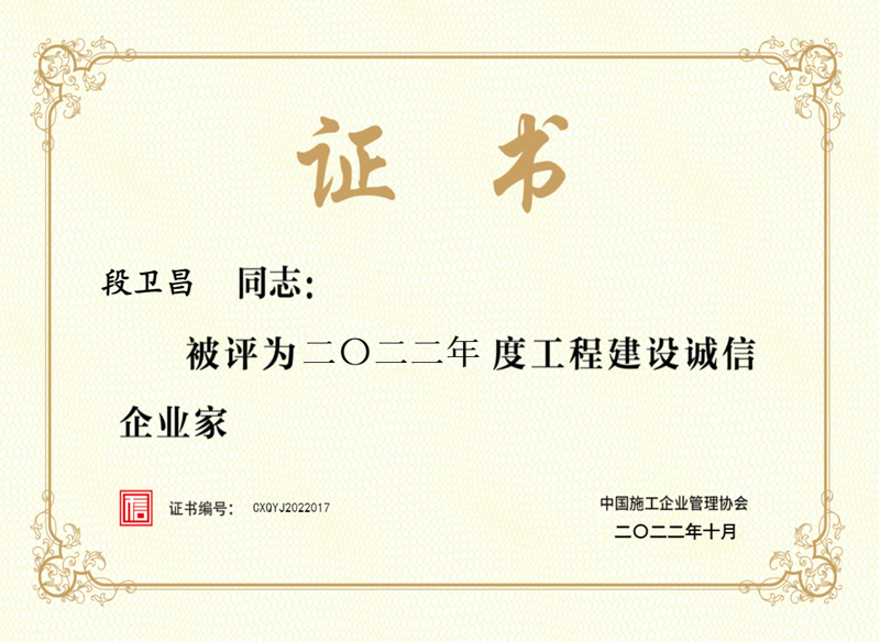 集團(tuán)董事長(zhǎng)段衛(wèi)昌榮獲二O二二年度工程建設(shè)誠(chéng)信企業(yè)家稱號(hào)