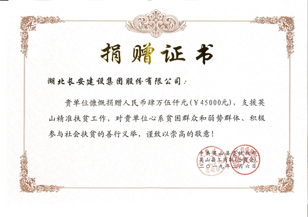捐贈(zèng)人民幣肆萬伍仟元支援英山精準(zhǔn)扶貧工作2019