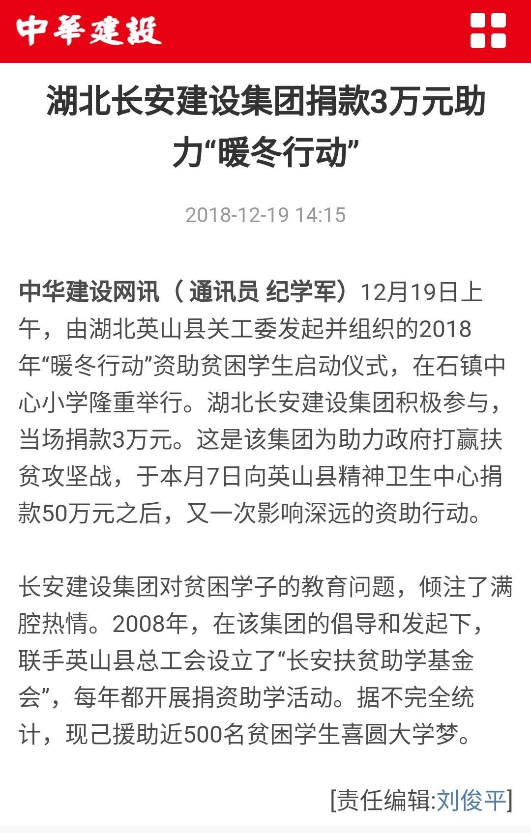 湖北長安建設集團捐款3萬元助力“暖冬行動”